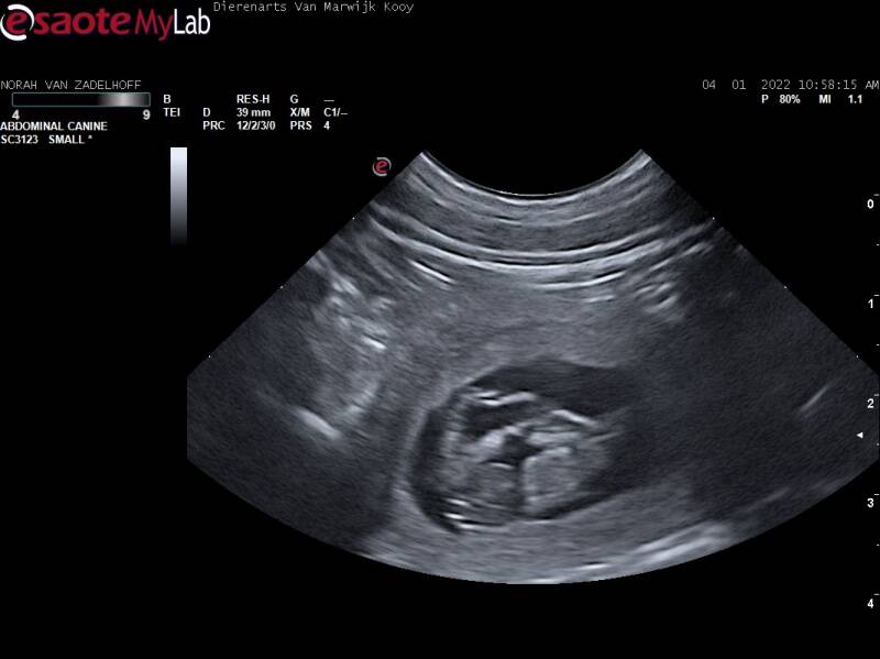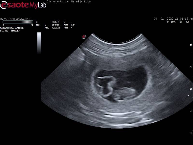 Vandaag hebben we bij onze eigen dierenarts in Oudewater een drachtecho bij Norah laten doen. Dit keer gelukkig positief nieuws! Op de echo was te zien dat Norah drachtig is!! Yesss! Norah is vandaag 25 dagen drachtig. Ze slaapt veel, heeft een verminderde eetlust, is erg aanhankelijk en lief. De verwachte geboortedatum van de pups is rond 11 februari. Hieronder kunt u enkele beelden van de drachtecho bekijken!