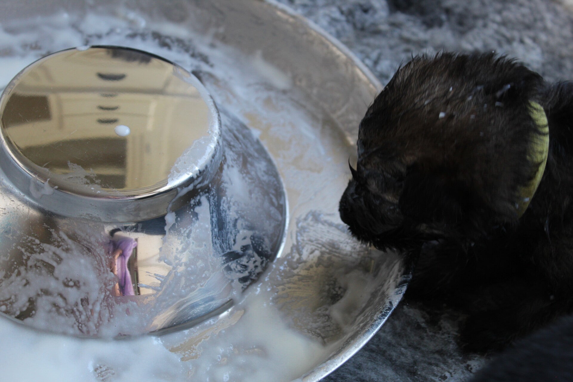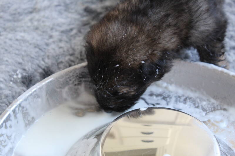 Pups zijn 3 weken oud en dan is het tijd voor: PAP! Vooral met zo'n groot nest. Norah doet het goed. Een topmoedertje. Ook werden de pups ontwormd toen ze 2 weken oud waren. En alle nageltjes werden geknipt. Die nageltjes zijn vlijmscherp en met het drinken kan dat pijnlijk worden voor Norah.